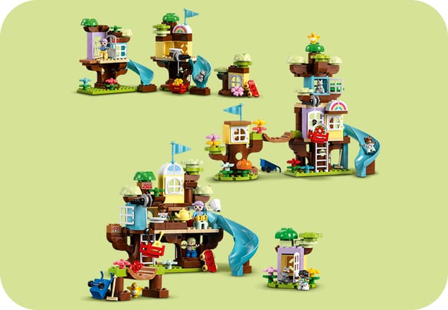Eerst bouwen kinderen een speeltuin met 3 verdiepingen, een superlange glijbaan en een wiebelige brug om over te steken. Als het regent, verandert het model in een gezellige boomhut. Het derde model bestaat uit 2 boomhutten, elk met een glijbaan, en een tuin waar kinderen fruit kunnen verzamelen en naar boven tillen met behulp van de katrol.